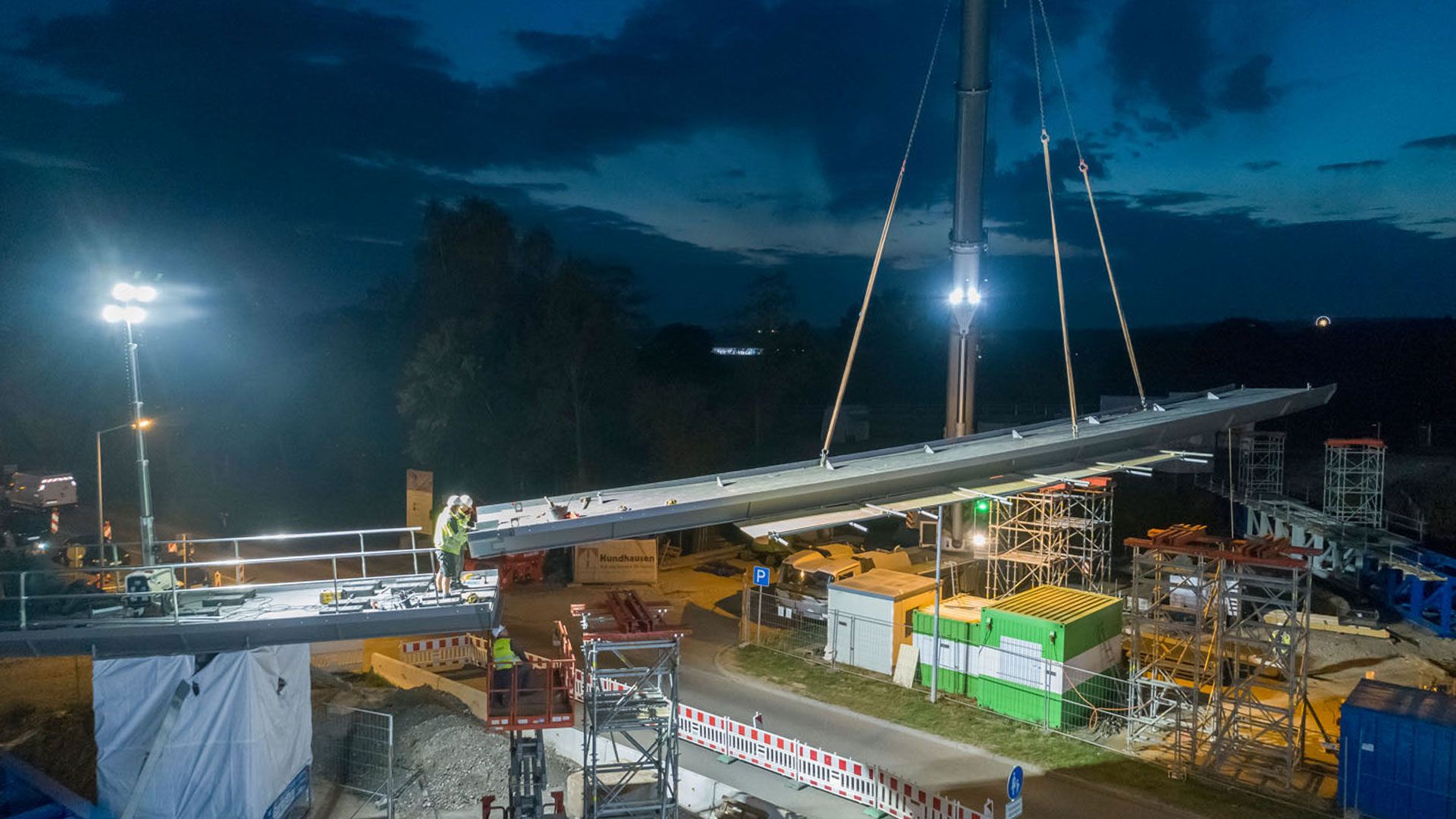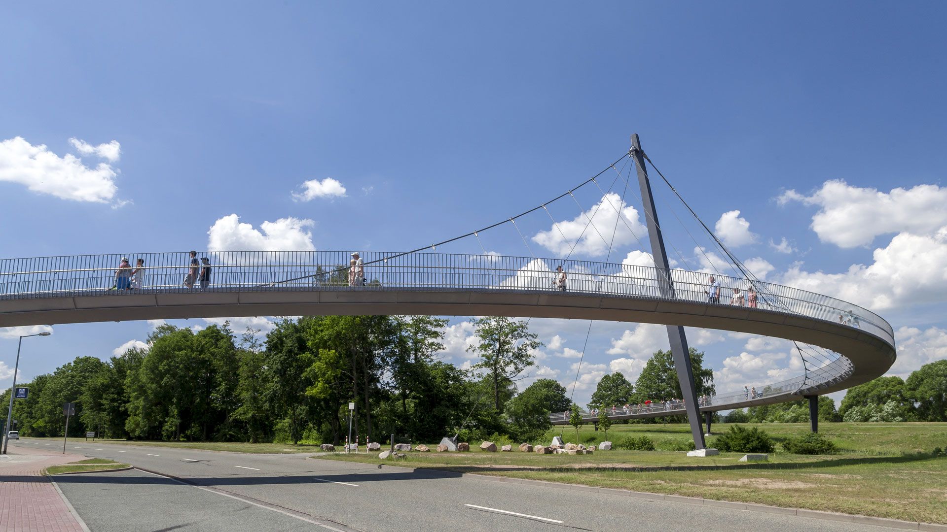 Das Projekt teilt sich in drei Bereiche: zwei Vorlandbrücken und eine Schrägseilbrücke mit Pylon. Im Bereich der Schrägseilbrücke wurden Teile des Brückenhohlkastens ausbetoniert, um eine Balance der Brücke zu erreichen.