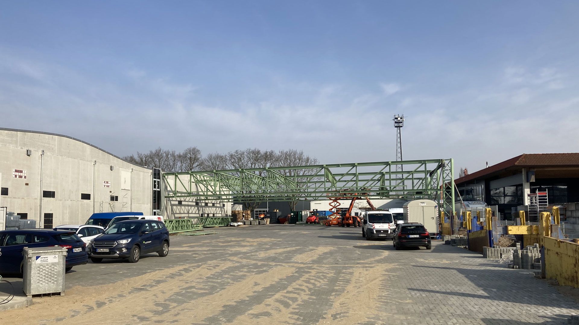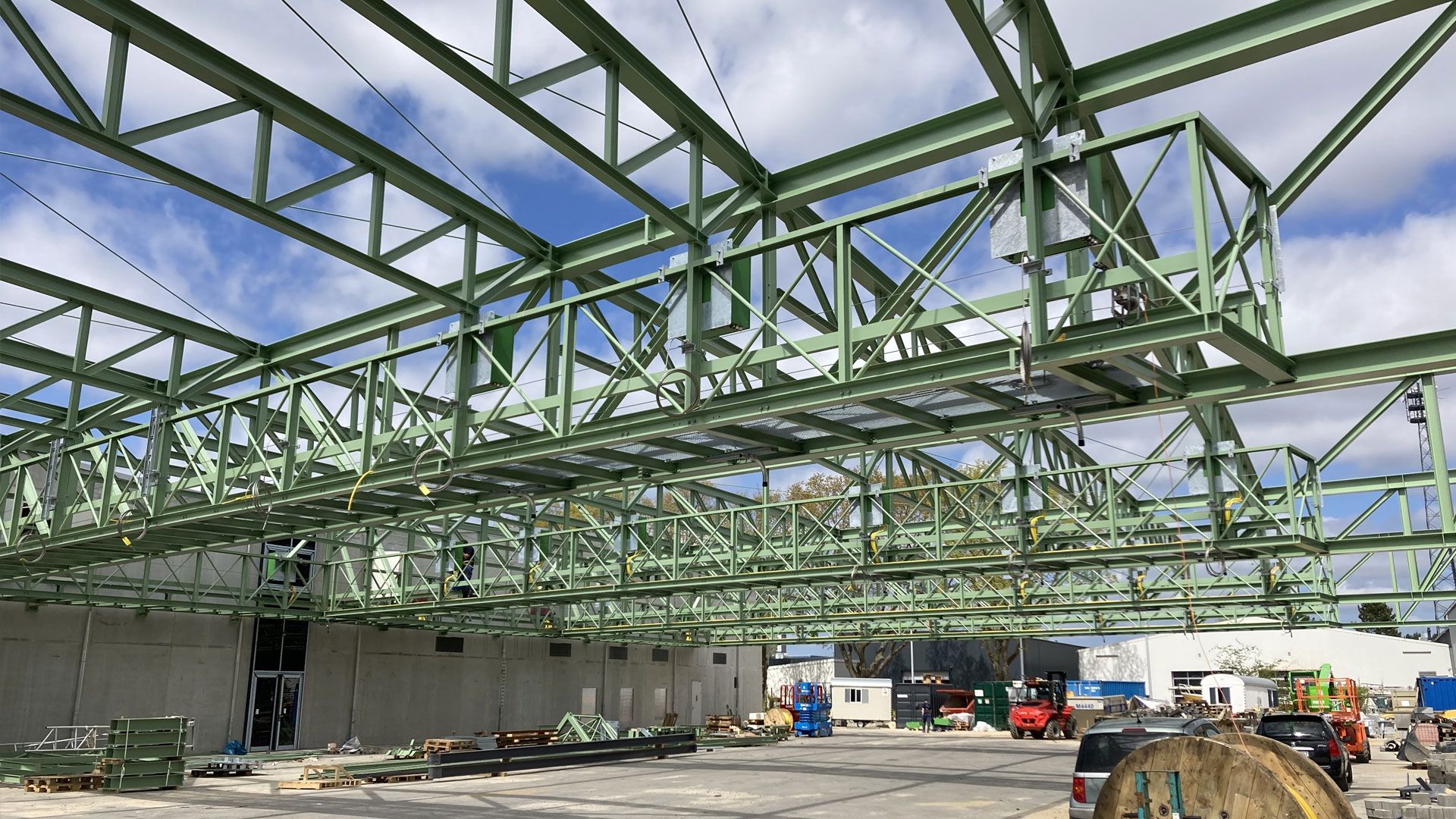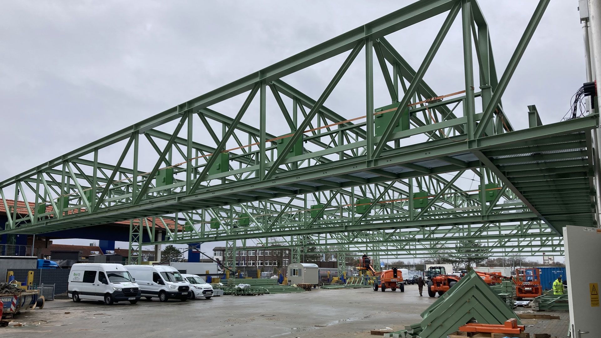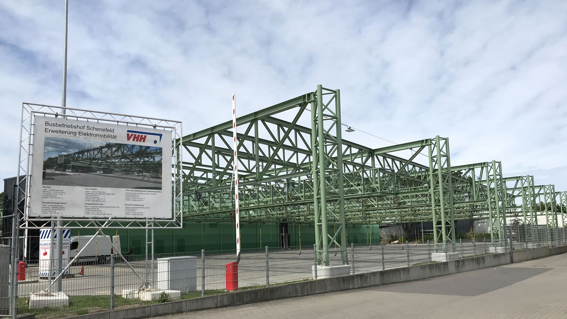 Vollack erbrachte die Stahlbauarbeiten zum neuen Busbetriebshof in Schenefeld bei Hamburg. Für die Ladeinfrastruktur der neuen E-Bus Flotte der VHH erstellten wir ein Stahltragwerk aus Fachwerken. Insgesamt wurden ca. 250 Tonnen Stahl verbaut.