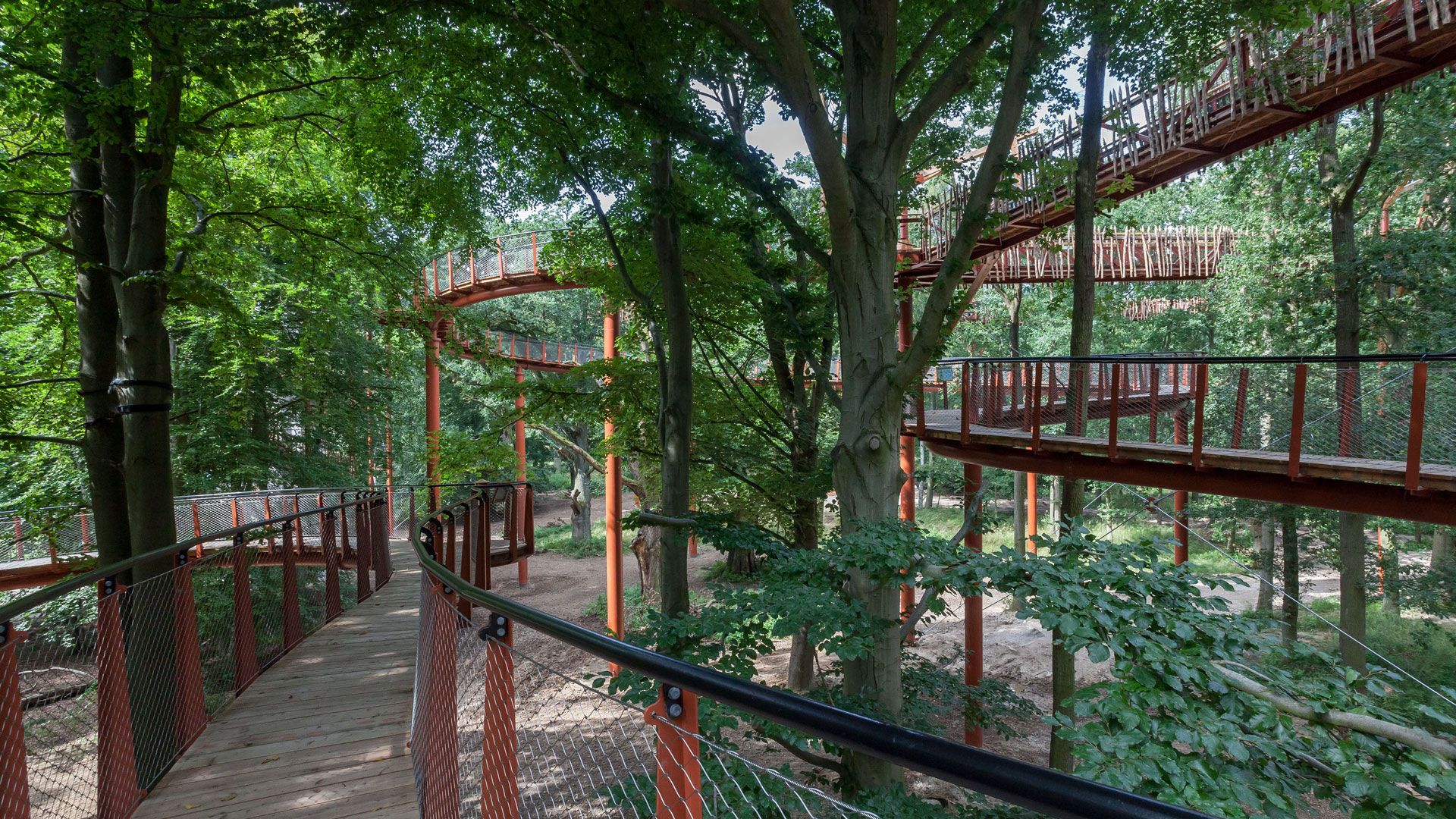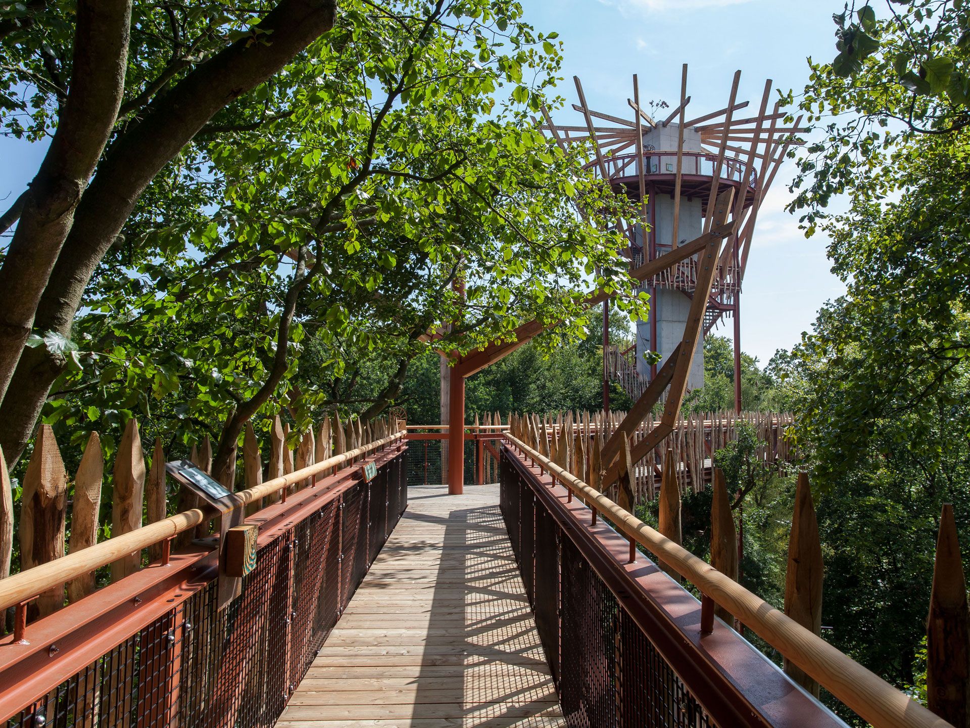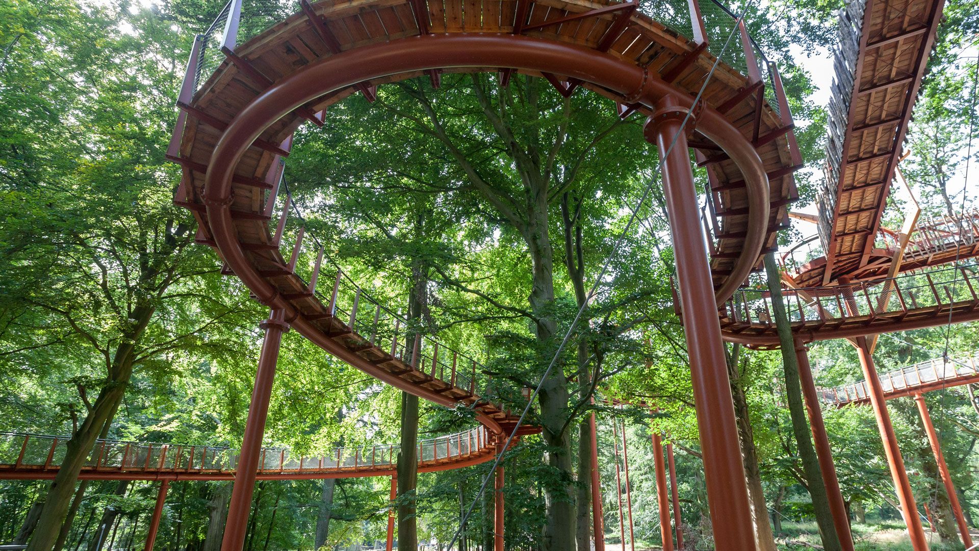 Vollack Hallen- und Stahlbau war erneut für die Errichtung eines Baumkronenpfades verantwortlich. Der 450 Meter lange Pfad besteht aus vertikalen und horizontalen Fachwerkträgern, die zu einem Trog zusammen gesetzt sind. Er wird über eine geschwungene Rampe erschlossen, die sich zum Pfad nach oben schlängelt. Die Fachwerkträger liegen auf Pylonstützen in einer Höhe von ca. 20 Meter auf.