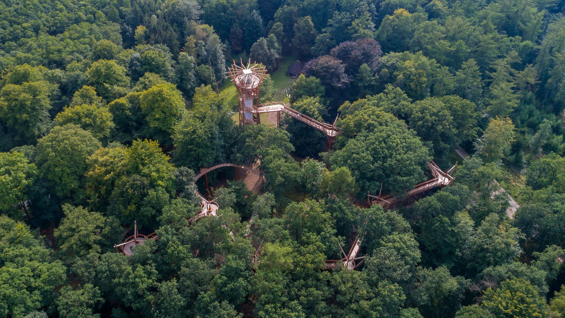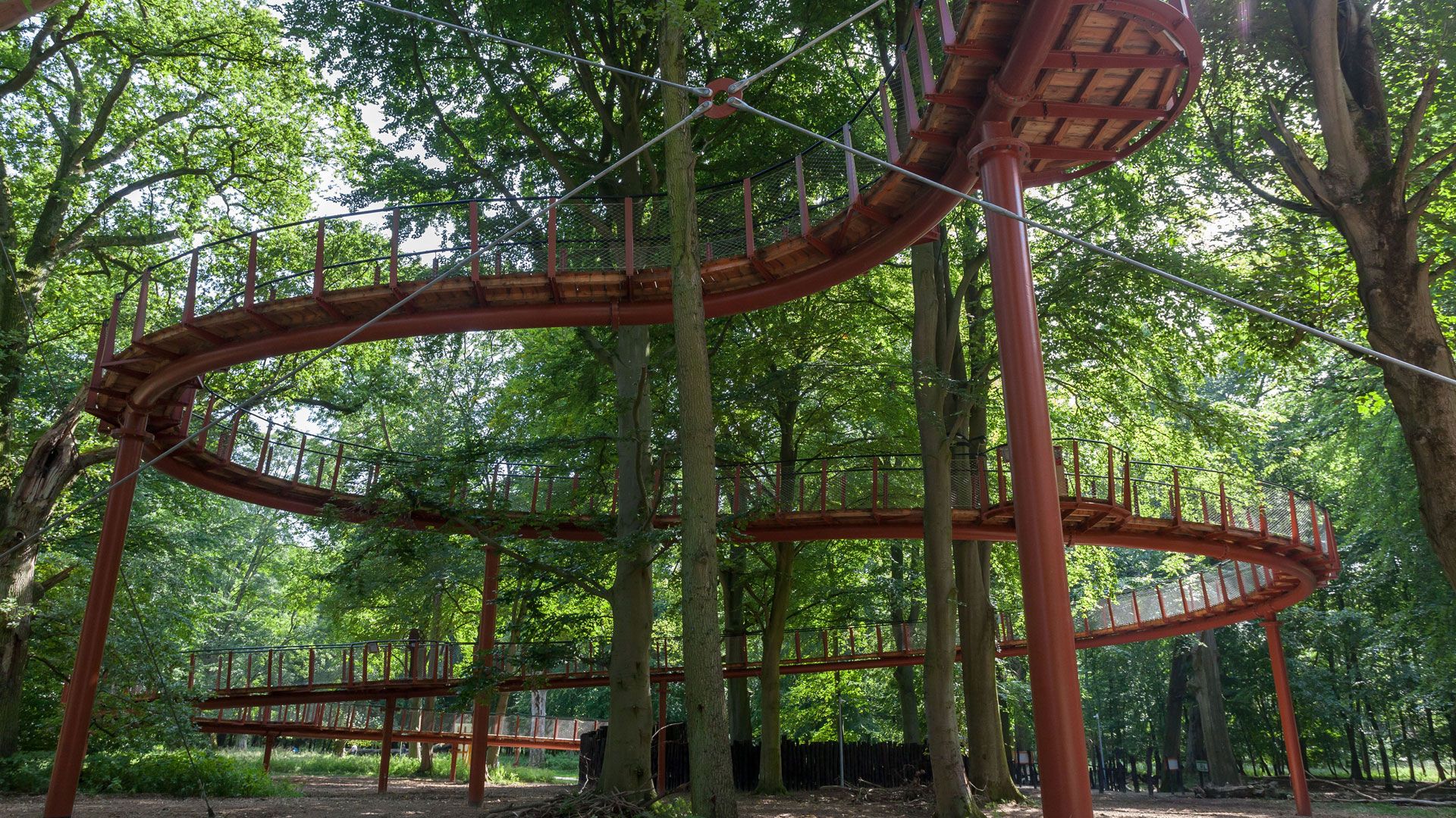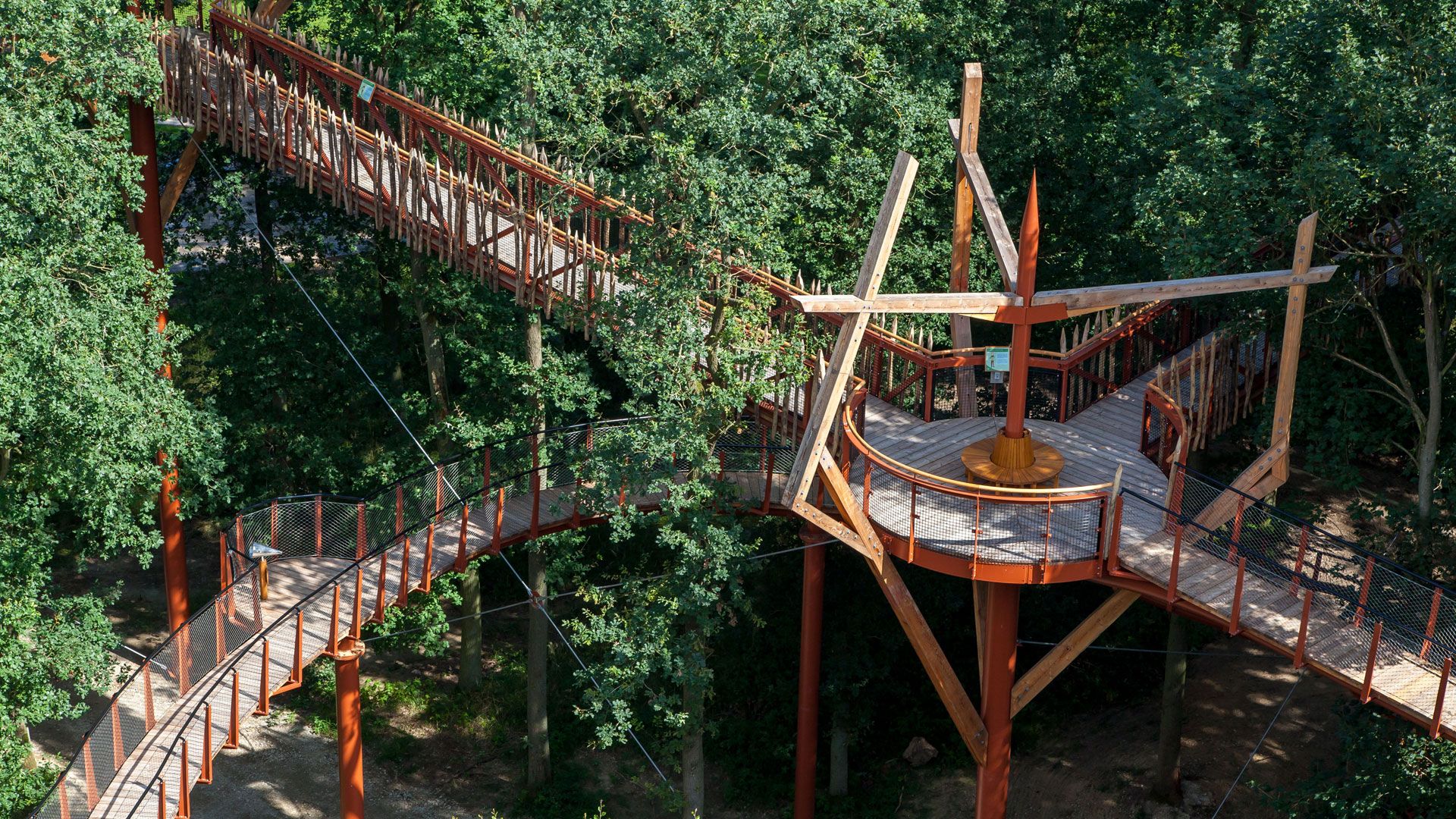Vollack Hallen- und Stahlbau war erneut für die Errichtung eines Baumkronenpfades verantwortlich. Der 450 Meter lange Pfad besteht aus vertikalen und horizontalen Fachwerkträgern, die zu einem Trog zusammen gesetzt sind. Er wird über eine geschwungene Rampe erschlossen, die sich zum Pfad nach oben schlängelt. Die Fachwerkträger liegen auf Pylonstützen in einer Höhe von ca. 20 Meter auf.