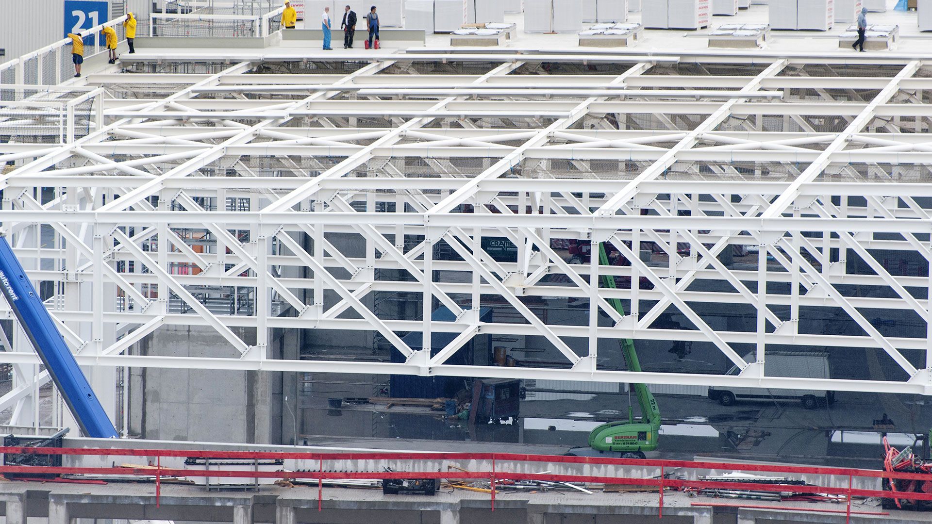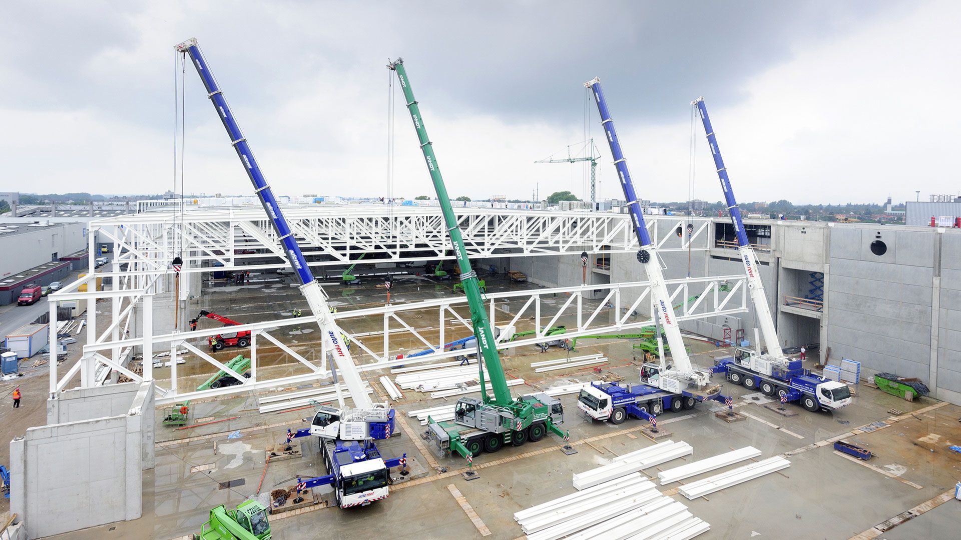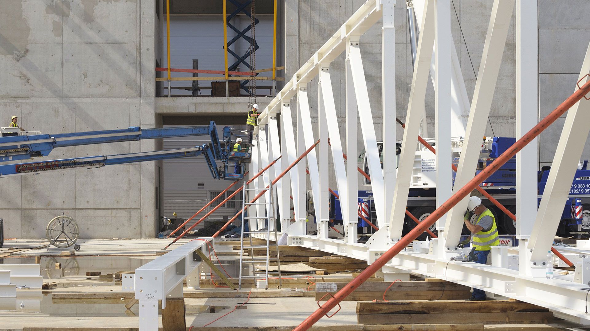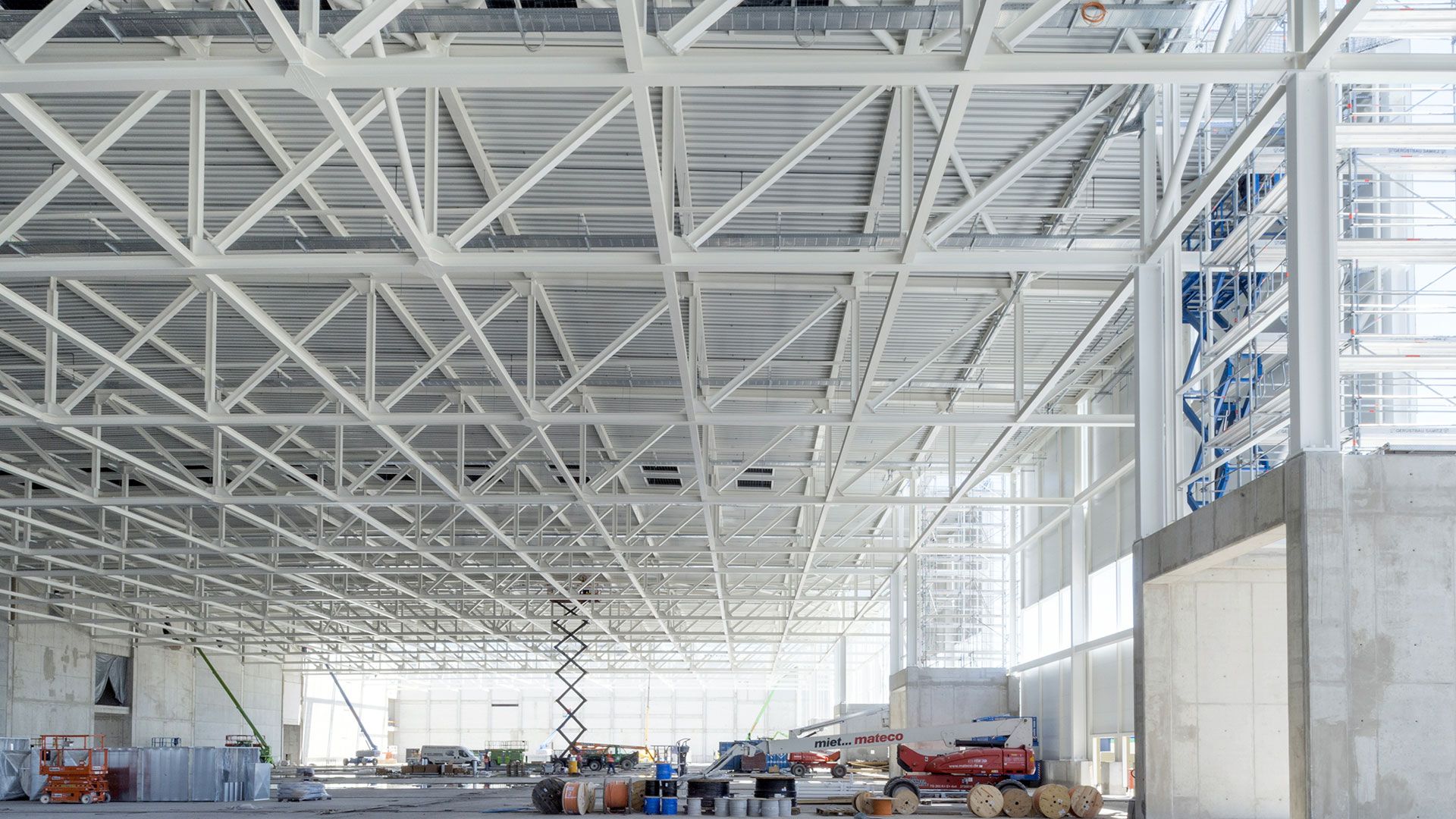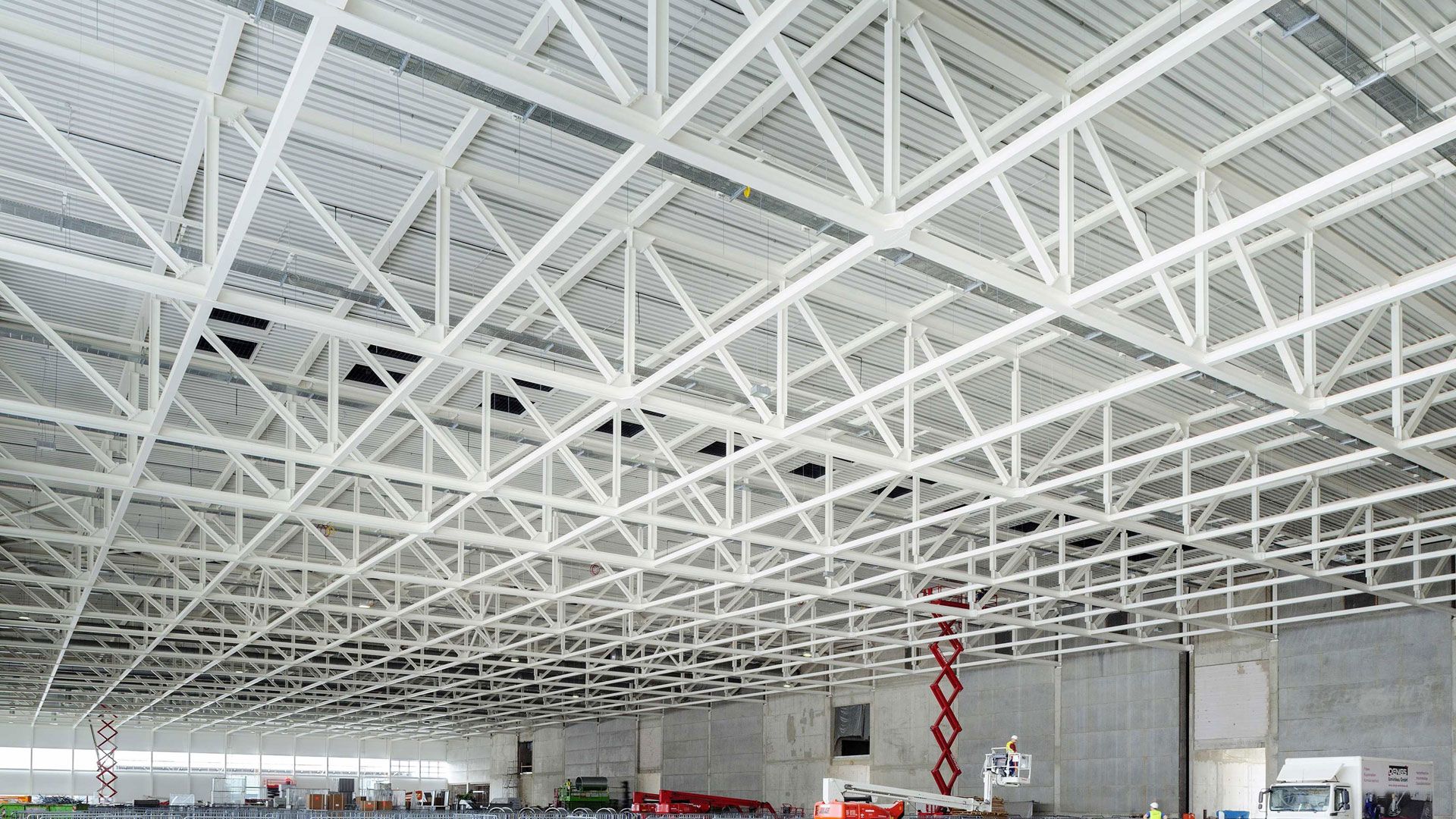 Für die Deutsche Messe in Hannover waren wir verantwortlich für die Planung, Fertigung und Montage eines Stahltragwerks für die mit 200 Meter Länge, 19 Meter Höhe und 90 Meter Breite große Messehalle. Die Dachkonstruktion besteht im Wesentlichen aus 75 Meter freigespannten Stahlfachwerkbindern mit ca. 5 Meter Höhe, die in Zweikranmontage montiert wurden. Gesamtumfang waren ca. 2.000 Tonnen Stahlkonstruktion und 16.000 Quadratmeter Trapezblech.
