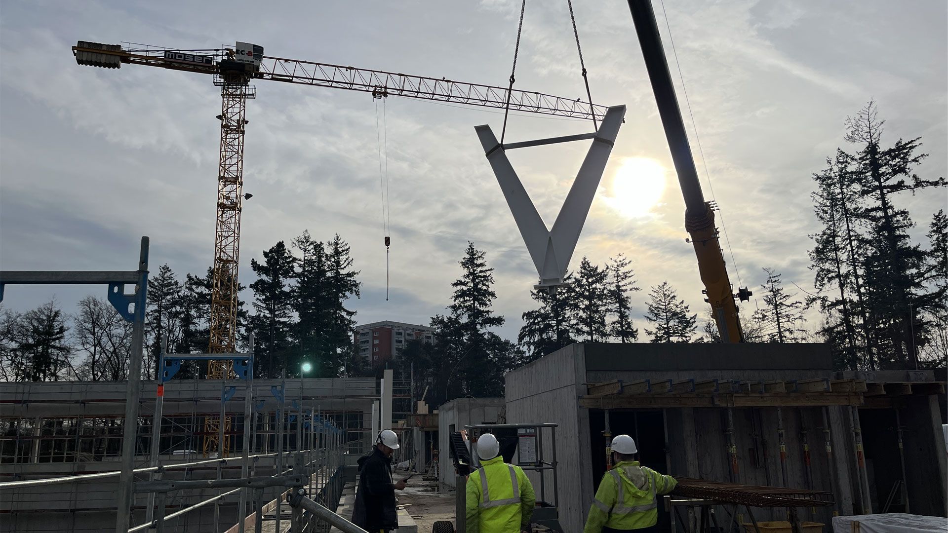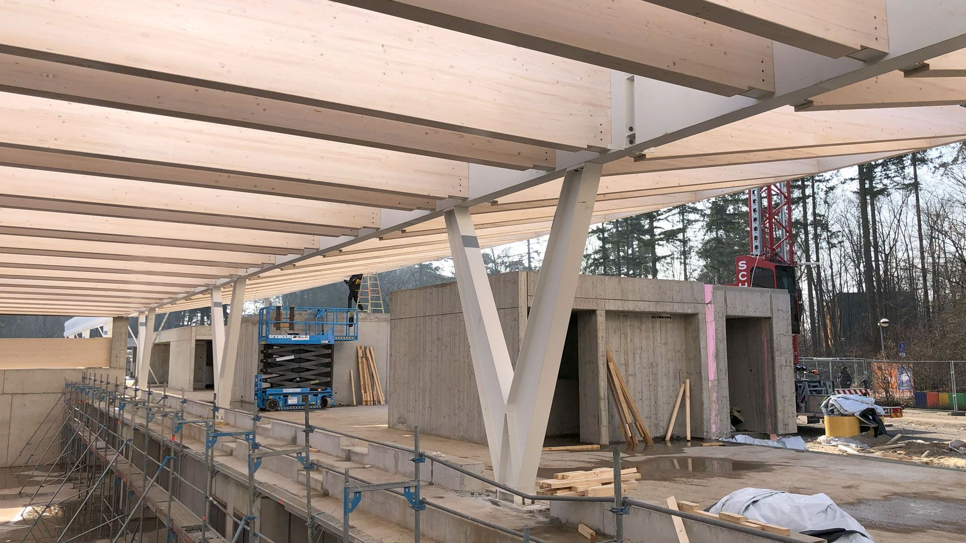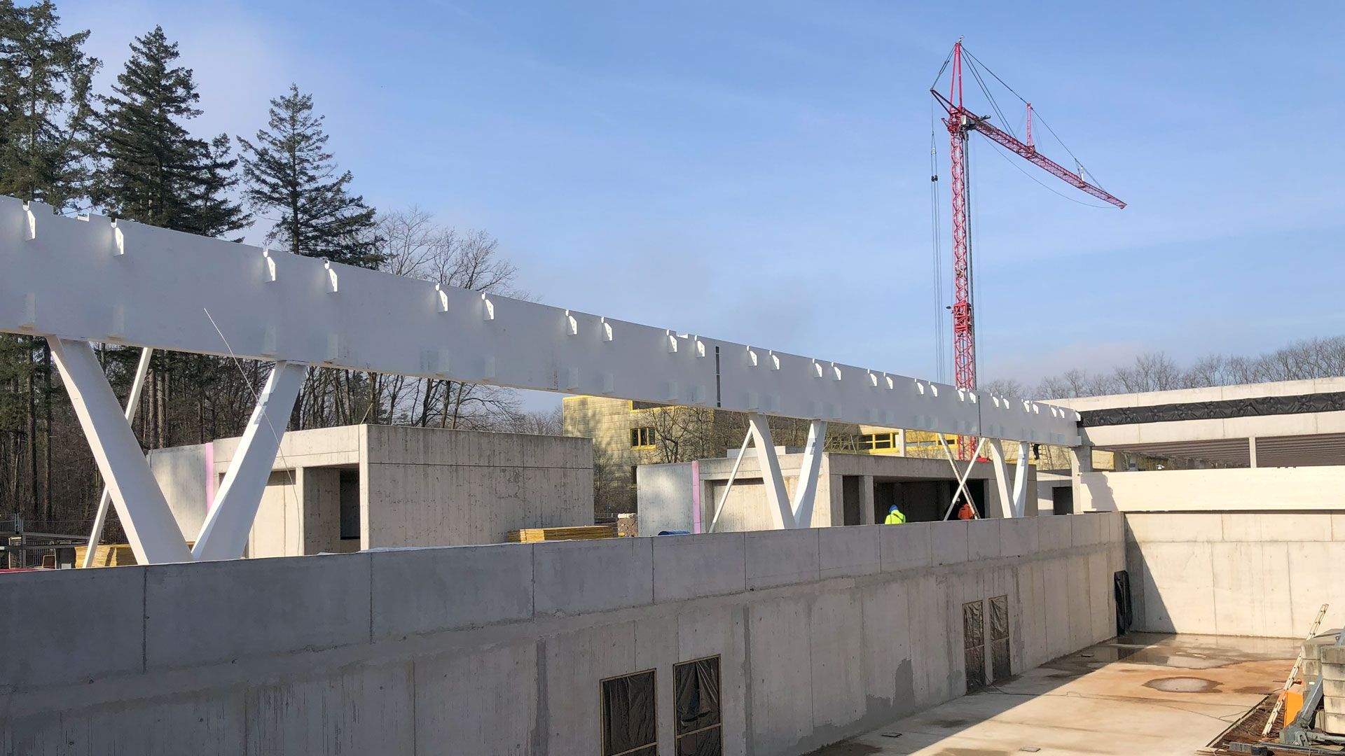 Am Schulzentrum Südwest entsteht eine neue doppelte Dreifachsporthalle. Vollack verantwortet die Stahlbauarbeiten der aus V-Stützen und Kastenträgern bestehenden Konstruktion.