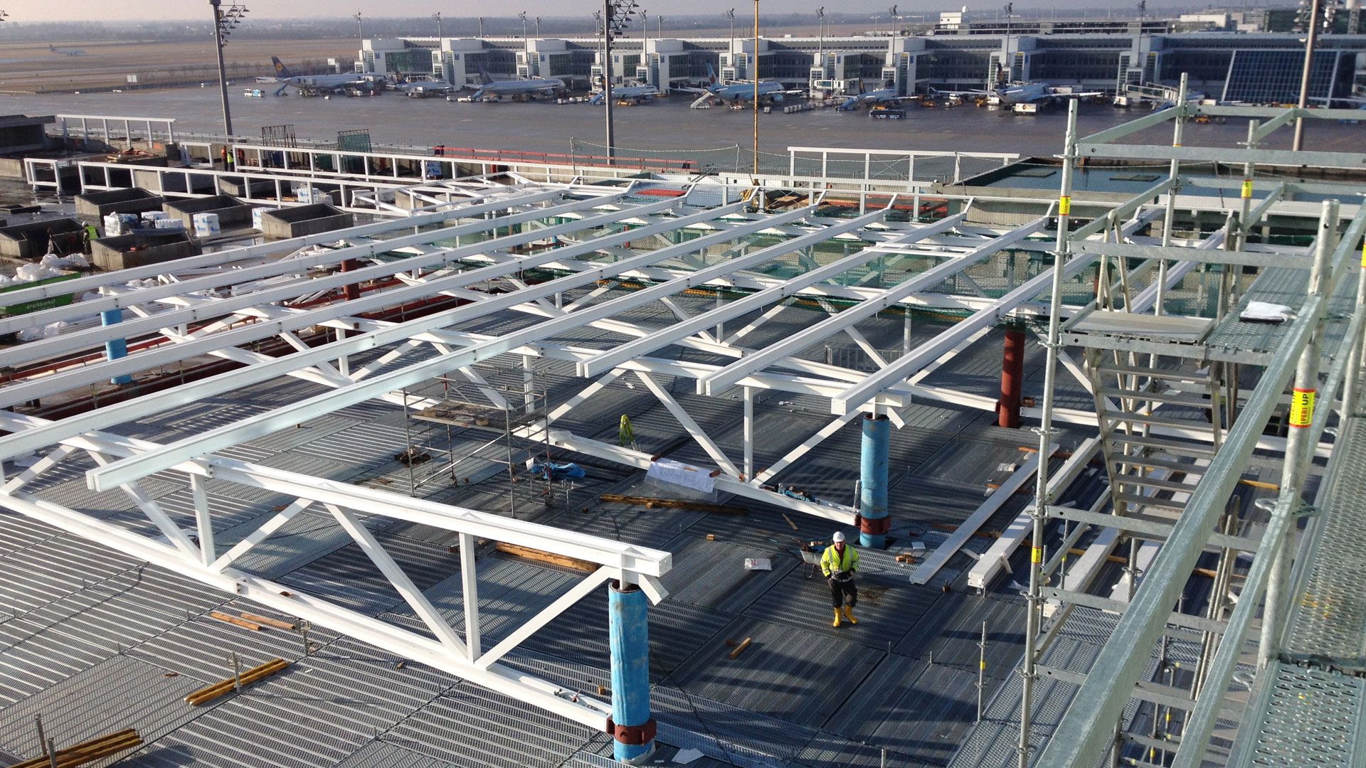 Am Flughafen München entstand das neue Satellitengebäude als Erweiterung des Terminals 2 für weitere 11 Millionen Fluggäste pro Jahr. Wir waren unter anderem mit der Stahlkonstruktion der insgesamt ca. 1.000 Meter langen Klimafassade und des Zentraldaches beauftragt.