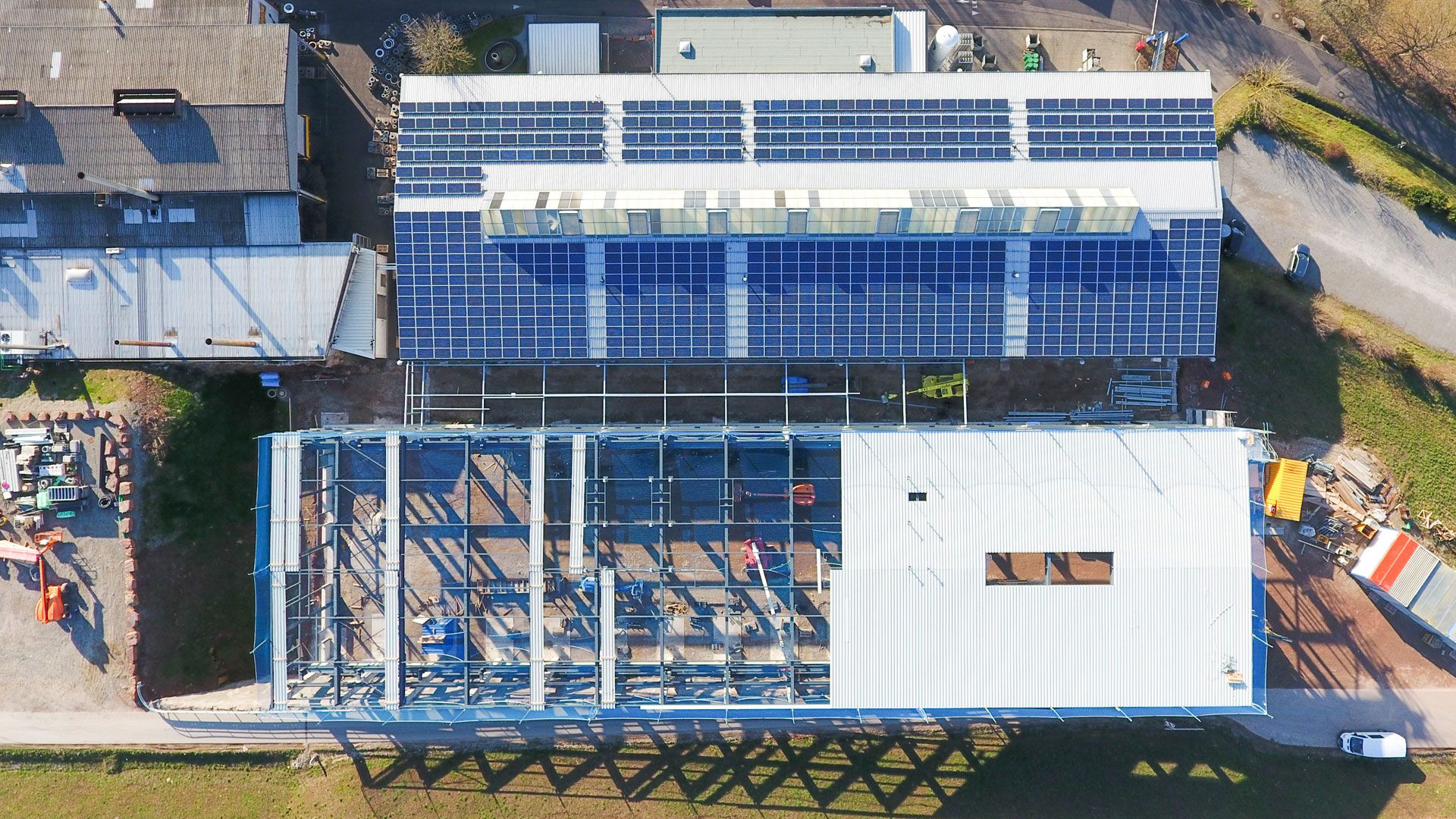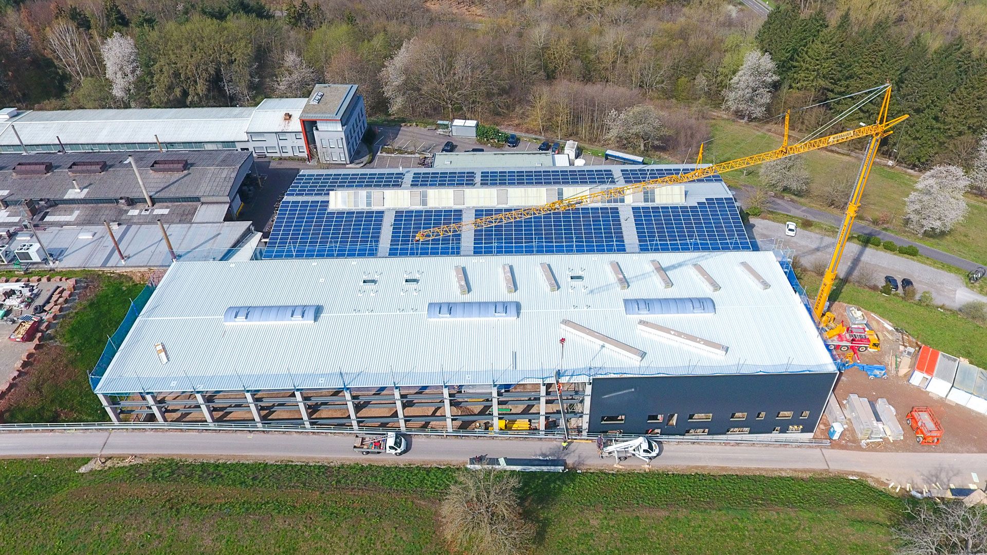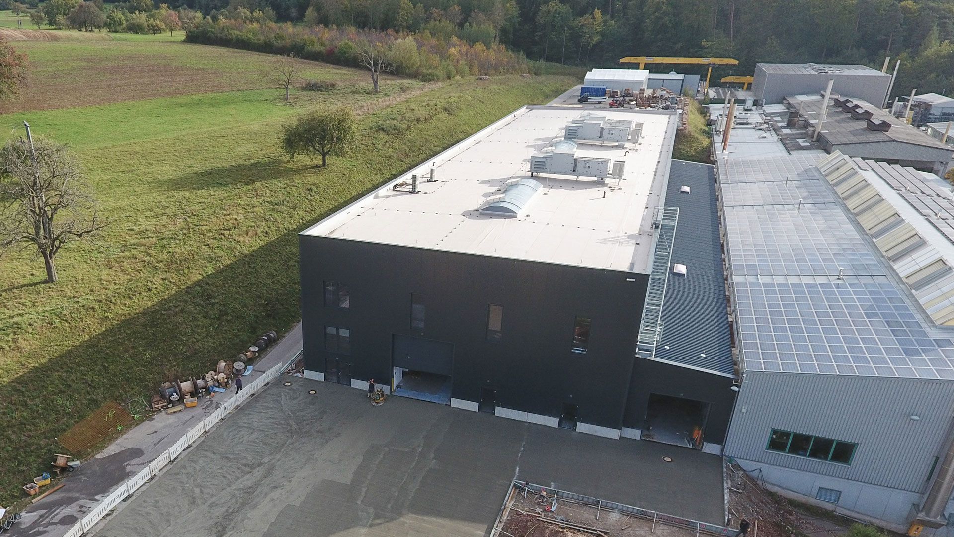 Die Vollack Hallen- und Stahlbau war mit den Stahlbauarbeiten und der Gebäudehülle beauftragt. Aufgrund der starken Hanglage ist das Gebäude sprichwörtlich „in den Fels gehauen“, der mit Stabankern und einer Spritzbetonwand gesichert wird. Zwischen Gebäude und Wand blieb nur ein 1 Meter breiter und bis zu 7 Meter hoher Streifen zur Wandmontage. Auf der anderen Seite begrenzt das Bestandsgebäude das sehr beengte Baufeld.